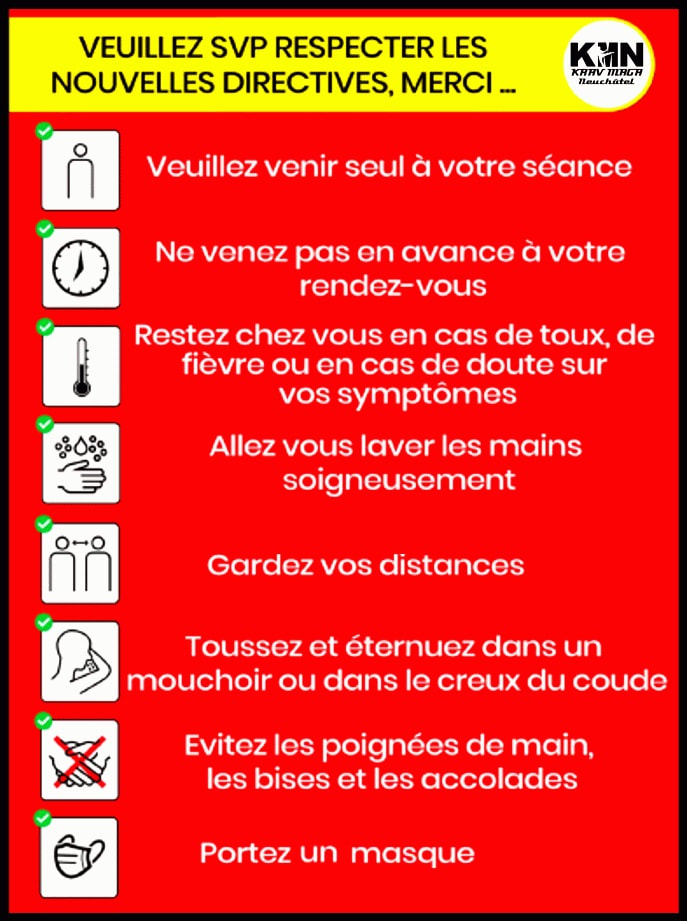 Dès le 06.12.2021, les élèves devront se présenter à la salle AVEC LE MASQUE et un certificat + pièce d’identité officielle (carte d’identité, permis de conduire, passeport). Le masque doit être porté jusque dans le vestiaire et ne pourra être enlevé qu’au début du cours.