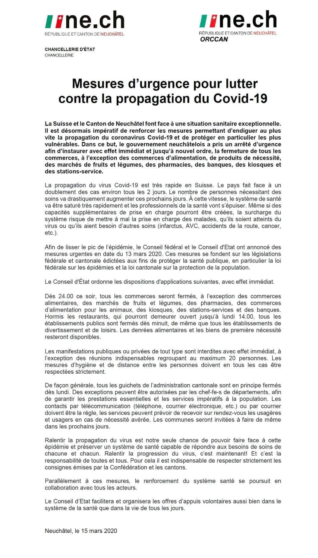 Plus d’infos : https://www.ne.ch/medias/Pages/20200315-mesures-urgence-lutte-covid19-canton-de-neuchatel.aspx
